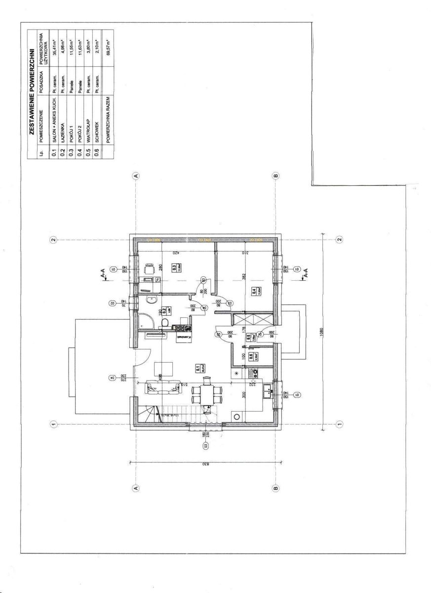 Układ domu zapewnia komfort 2-4 osobowej rodziny. Sercem domu jest przestronna strefa dzienna: salon z aneksem kuchennym o pow 35m2 z wyjściem na przestronny taras. Jest bardzo dobrze doświetlony, zamontowano dwa duże okna. Jest również miejsce na kominek. Trzy komfortowe pokoje zaspokoją potrzeby nawet 4 osobowej rodziny. Dwie sypialnie na parterze mają powierzchnię: po ok. 11,5m2. Łazienka ma pow. 5m2. Na piętrze znajduje się trzecia sypialnia i wc.